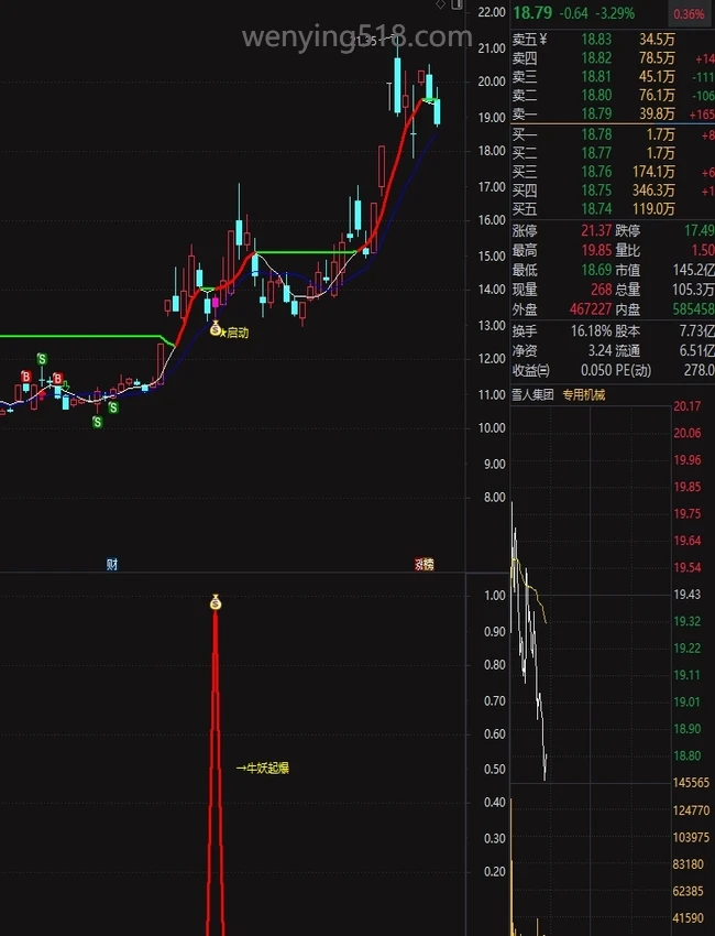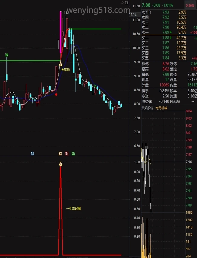 操作策略:当“牛妖启动”信号出现且当日收阳线时,视为潜在买入机会。 该信号需结合价格突破长期趋势线、特定K线组合(如前期大阳线+当前小实体阳线)共同确认。